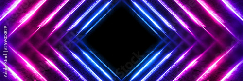 Dark tunnel with neon lights, lines, spotlights. Abste dark background with neon.