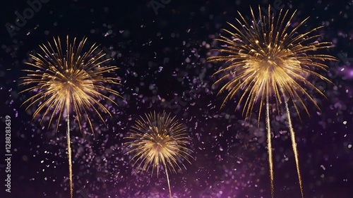 Dark Violet Sky with Exploding Gold Fireworks and Bokeh