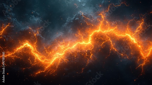 Dark void background with fractured orange lightning-like streaks, energetic and powerful abstract concept