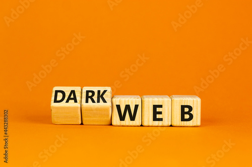 Dark web symbol. Turned wooden cubes and changed the word web to dark web. Beautiful orange background. Business, dark web concept. Copy space.