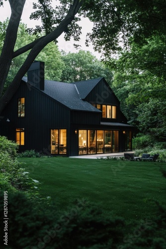Dark wooden house surrounded by lush greenery in the evening light showcasing modern architecture and cozy ambiance from large windows