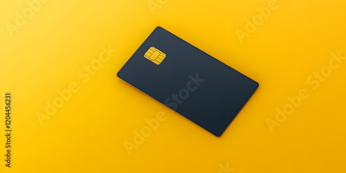 Dark-colored payment card with a microchip on a vibrant yellow background. Ideal for finance, technology, and banking concepts.