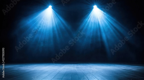 darkened theater stage illuminated by two bright blue spotlights, creating dramatic atmosphere perfect for performances