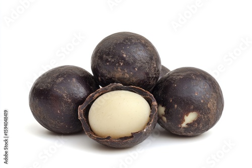 Dark-shelled nuts, one cracked open, revealing creamy interior