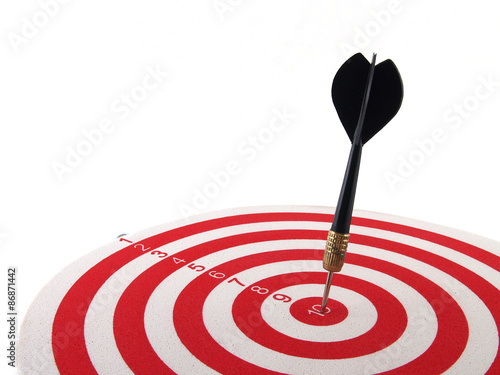 dart arrow hitting on bullseye target center in dartboard isolated on white