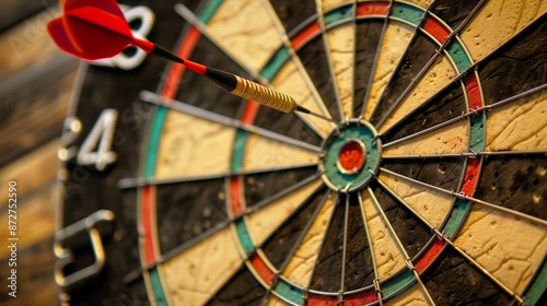 Dart Hitting the Bullseye on a Dartboard. . The sharp focus on the dart and the center of the dartboard highlights the precision and accuracy achieved.
