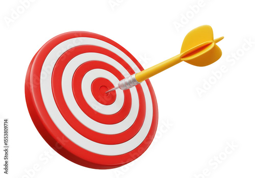 Dart hitting the center of a red and white target, illustrating precision and accuracy in achieving goals on transparent background
