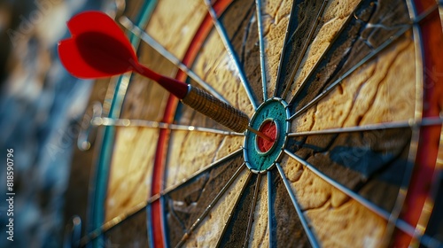 Darts, an arrow hitting the bullseye on a dartboard, focus on the target with a blurred background. Concept of success and goal achievement in business or sports.