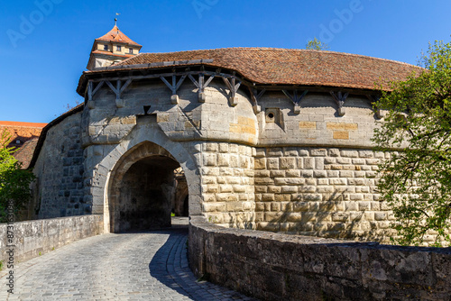 das berühmte Spitaltor mit historischem Wehrgang am Rande der Altstadt von Rothenburg ob der Tauber, Deutschland