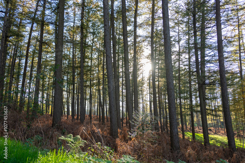 Das Bild zeigt eine malerische Waldlandschaft, in der hohe, majestätische Bäume in verschiedenen Grüntönen emporragen.