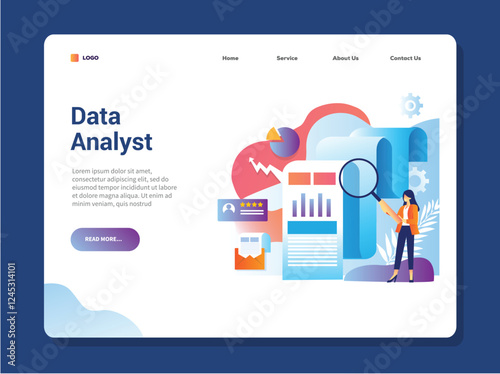 Data Analis woman holding a big magnifying glass a concept of data scientist landing page