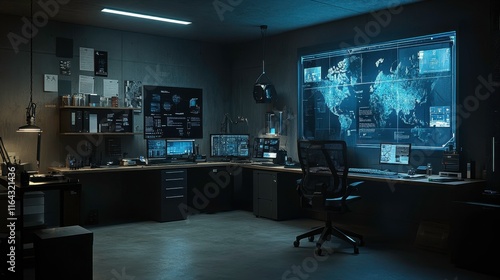 Data analysis hub modern office digital workspace technology environment overhead view cybersecurity insights