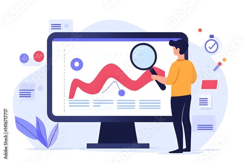 Data analysis illustration, a person examines data chart through magnifying glass on monitor, depicting the core of digital analytics.