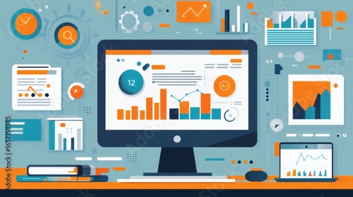 Data analysis on desktop computer screen with charts, graphs, and reports.