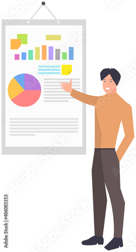 Data analysis research statistics concept. Work with statistics, strategy, business development. Male employee talks about results of statistical research. Man near presentation board with data