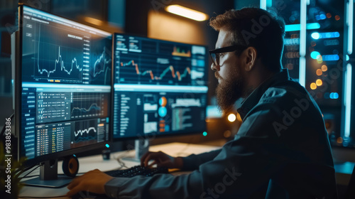 Data analyst working on multiple screens, analyzing financial charts and graphs in modern office environment.