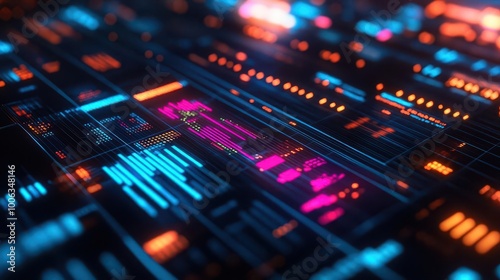 Data analytics with vibrant graphs and charts, sleek digital interface, soft lighting, futuristic style, high contrast