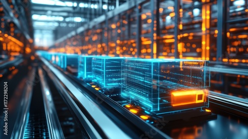 Data center server blocks on conveyor belt.