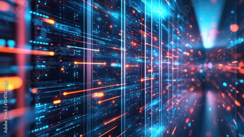 Data Center Server Racks with Bright Lights and Data Transfer