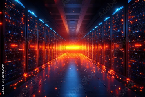 Data Center Server Room with Fiber Optic Cables and Computer Servers