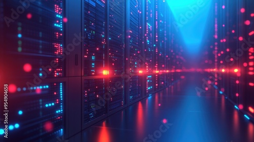 Data Center Server Room With Red And Blue Lights - Technology Abstract Background.
