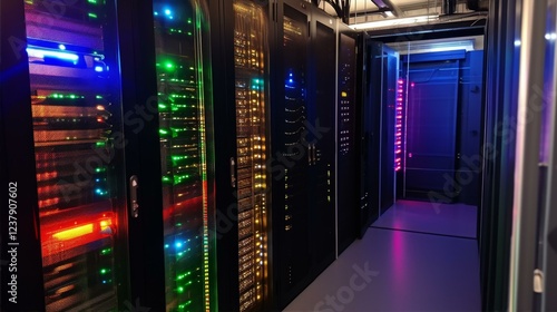 Data Center Servers Glow With Power Amidst Racks In Dark Hallway Tech Infrastructure