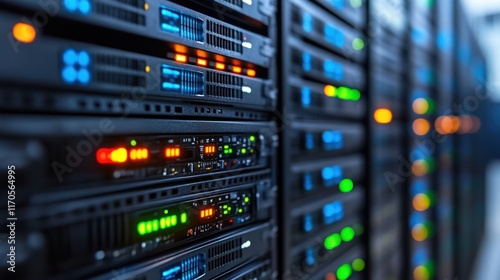 Data center servers glowing, rack-mounted, network infrastructure, background blurred, technology
