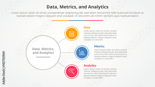 Data metrics and analytics infographic concept for slide presentation with circle link connection line network with 3 point list with flat style