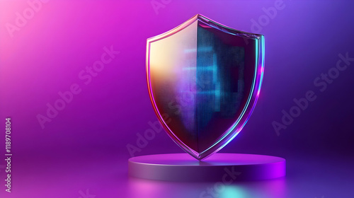 Data protection concept represented by a vibrant holographic shield with a glowing purple edge and seamless data flow texture