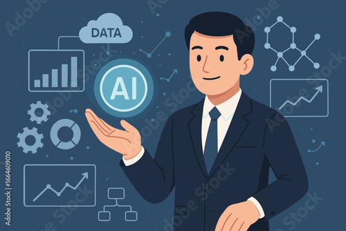Data science analytics and business algorithm. Businessman holding AI icon and strategy analysis on interface. Cloud computing, big data for financial and marketing growth.