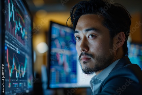 Data Scientist. Focused man at a workstation. Man intently observing charts on multiple monitors in an office setting. For representing serious work in trading or finance. Photograph, horizontal
