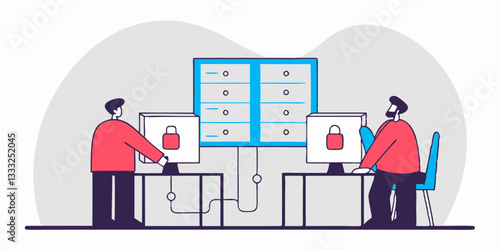 Data security and privacy illustration with users, locked computers, and a server cabinet.