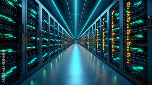 Data Server Room Long Corridor with Glowing Lights and Rows of Cabinets for Computing Power