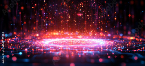 Data streams converge at a glowing central hub forming a vibrant digital landscape.