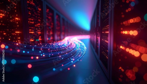 Data streams flow through a futuristic server room, illuminating the rows of powerful computer servers with vibrant light trails.