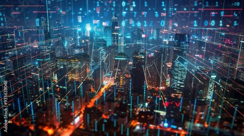 Data theme hologram drawing on city view with skyscrapers background multi exposure ,Cyberpunk urban landscape illuminated by neon lights at night ,A bustling city of the future,