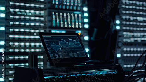 Data Visualization on Mainframe Computer with High-Tech Laptop, Blue Lines and Graphs, Advanced Storage System Atmosphere