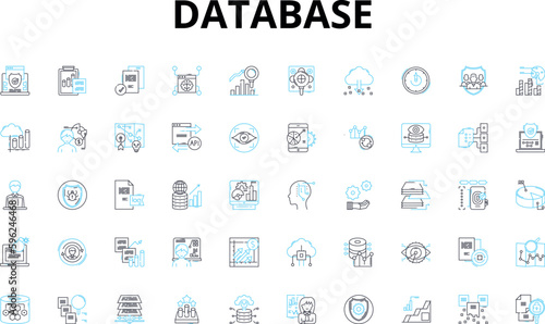 Database linear icons set. Retrieval, Normalization, Interoperability, Partitioning, Sharding, Backup, Clustering vector symbols and line concept signs. Transaction,Archiving,Encryption illustration