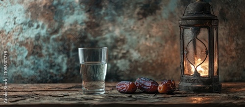Dates and water glass beside a lantern on rustic wood surface with textured background and ample copyspace for design or text usage