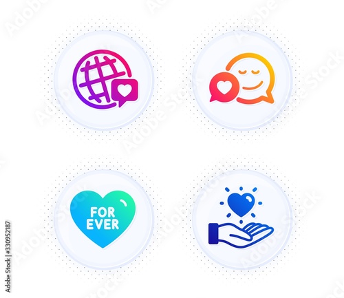 Dating, World brand and For ever icons simple set. Button with halftone dots. Hold heart sign. Love messenger, Love. Love set. Gradient flat dating icon. Vector
