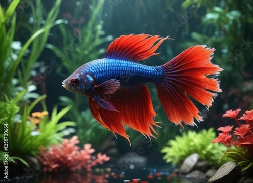 Dazzling betta with bright red fins and flowing crown tail amidst colorful aquatic plants, aquarium art, dazzling appearance, betta fish