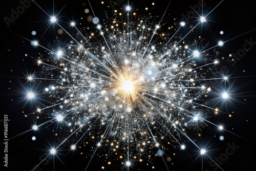 Dazzling silver sparks radiate from the center of a dark black background, creating a mesmerizing and luxurious visual effect with an air of sophistication and elegance.