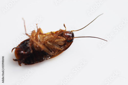 Dead brown cockroach after aplication of insect repellent for pest controlling. Close up shot on a white isolated background.