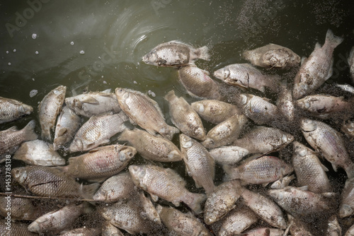 Dead fish in polluted water. Ecological disaster, global warming and catastrophe. Water pollution and global ecology problem