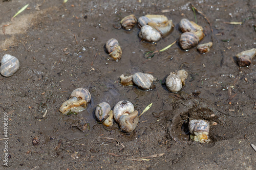 Dead grape snails on wet ground. A fly crawls over the decompos