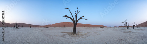 Dead tree and dunes with blue sky in desert, Namibia, Africa.