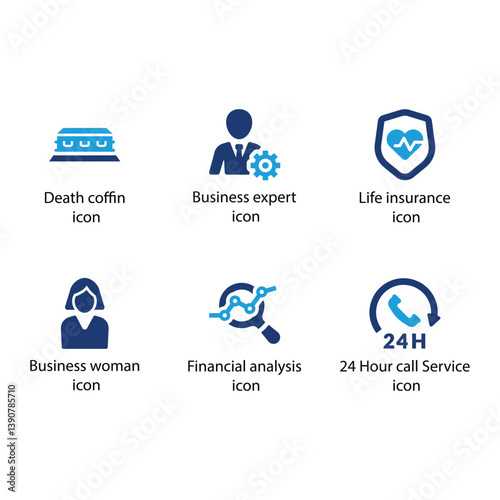Death coffin, expert, Life insurance, Business woman, Financial analysis, 24 Hour, Blue Icon Set