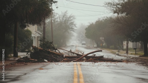 Debris-strewn street after a storm. A damaged road blocked by fallen trees and branches in a neighborhood affected by a powerful weather event. The scene displays aftermath, destruction, and damage