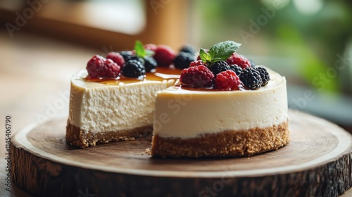 Decadent Cheesecake Delight: A creamy, classic cheesecake adorned with fresh raspberries and blackberries, a slice removed, sits on a rustic wooden board.