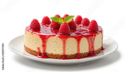 Decadent cheesecake topped with fresh raspberries and vibrant raspberry sauce on a white plate
